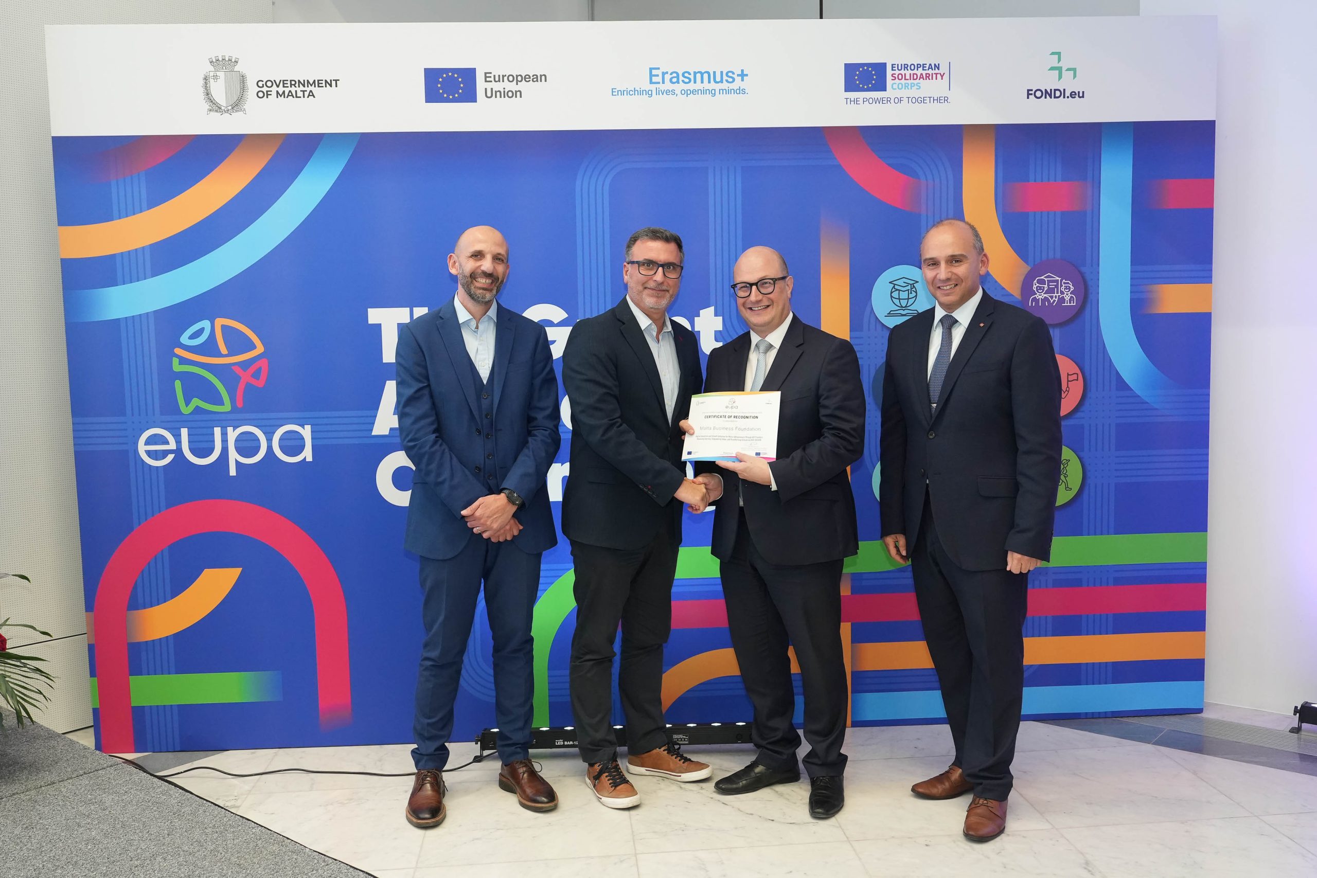 Mario Xuereb, MBB CEO, flanked by Stefan Zrinzo Azzopardi, Minister for European Funds and the Implementation of the Electoral Programme; Jonathan Vassallo, Permanent Secretary; and Raphael Scerri, EUPA CEO.